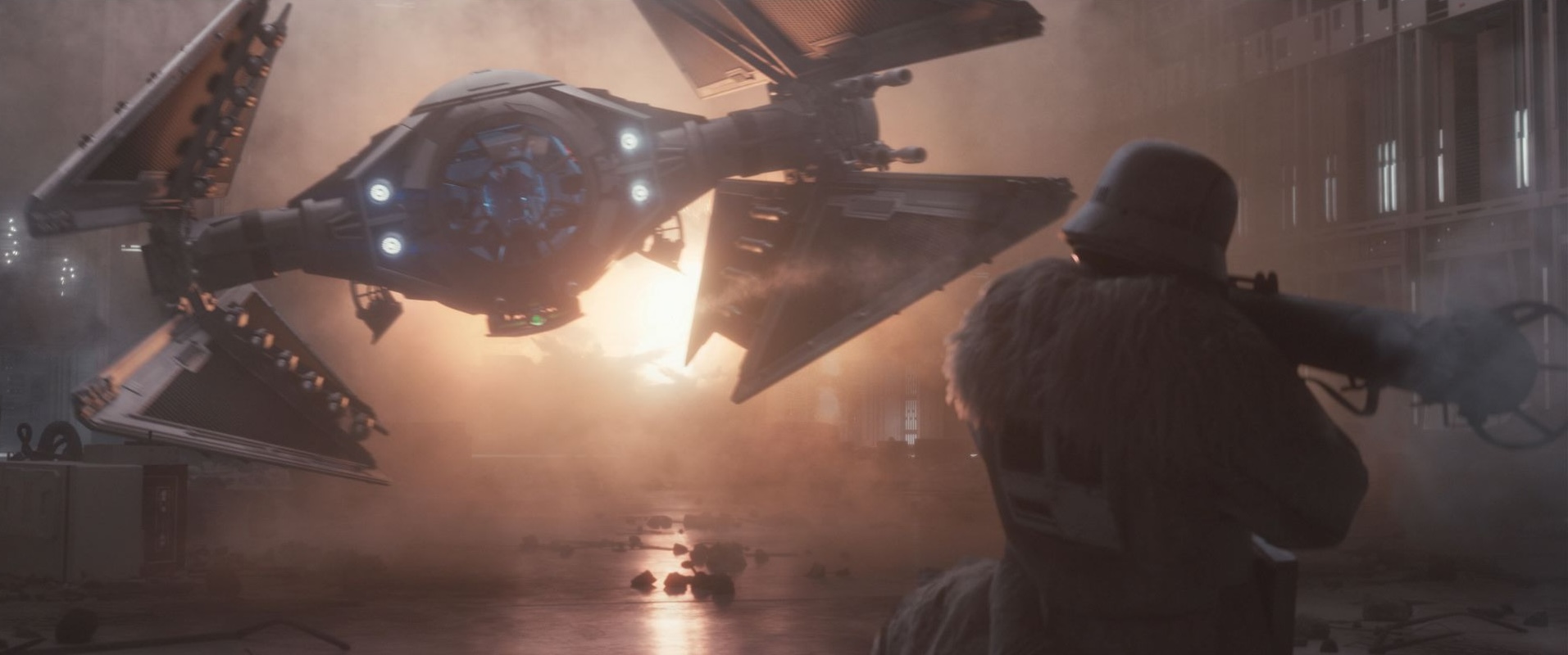 As Andor’s ILM visual effects supervisor, Scott Pritchard helmed his team at ILM’s London studio, while coordinating the work at ILM’s studios in Vancouver and Mumbai. When it came to the Avenger’s breakout from the Sienar hangar, Pritchard observes that the production sought to use the “best tool for the job,” often pairing ILM’s CG expertise alongside special effects supervisor Luke Murphy’s practical effects. Highlighting a shot where an Imperial range trooper takes aim at the Avenger, Pritchard beams, “There’s a huge staged explosion along the back wall that was done by hanging a line of charges. They explode in sequence, so they explode outwards from the center. That in itself is impressive because it gives us some great visual reference to go on and actual practical elements to incorporate into the final comp.