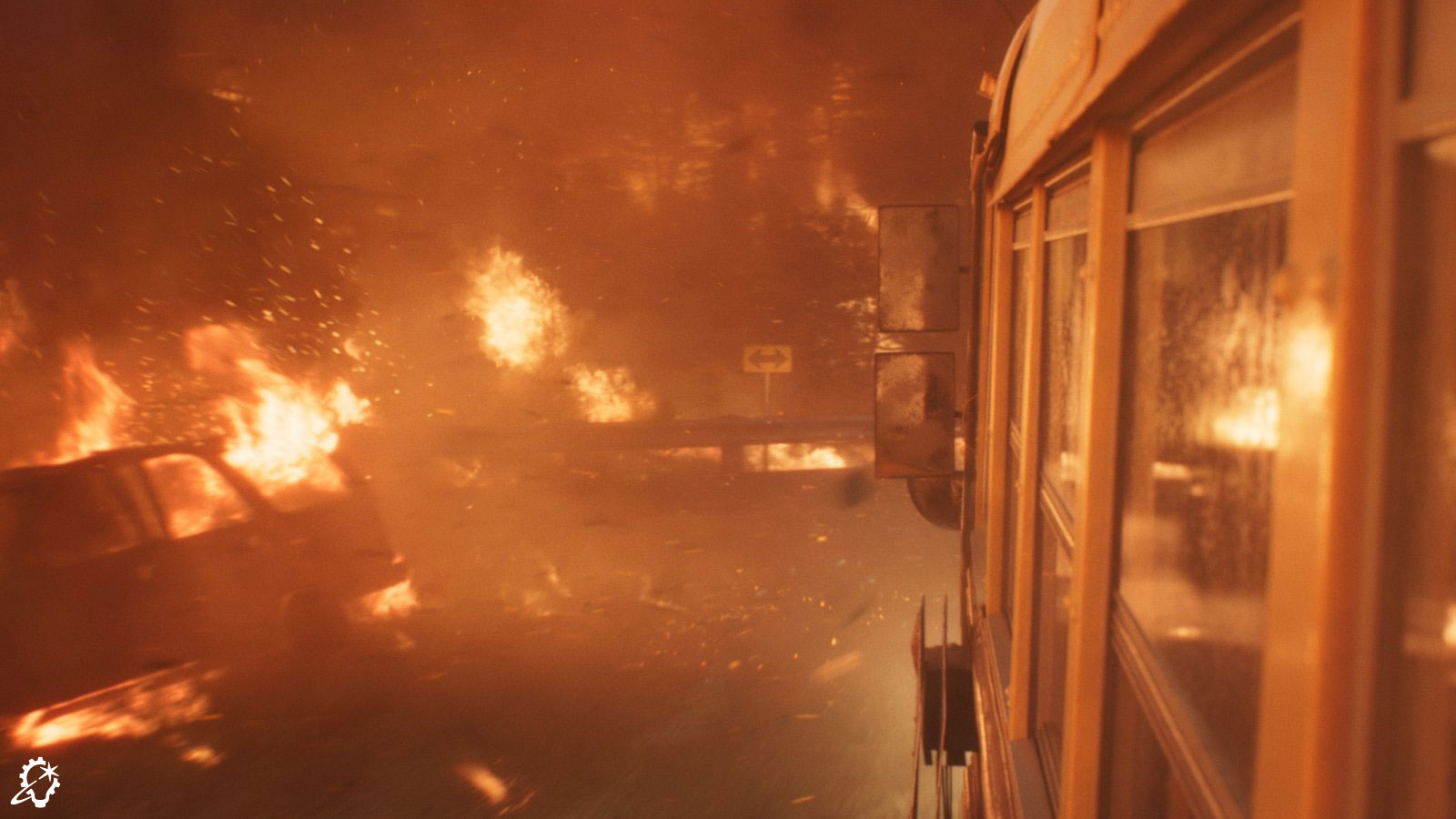 “That shot was an interesting one to put together, to transition from one environment to another, as we did end up needing to go all digital. The daytime section was the same environment we built previously, but because it’s bright out, we had to confirm all the details, like the tree simulations and so on, were there. We put in the CG bus windshield with the wipers, and we had a simulation for the embers. The bus was splatting into the embers, and due to the speed of the bus, the embers sort of floated to the side and got caught underneath the windscreen wiper. All of these details helped convey the sense of travel.”