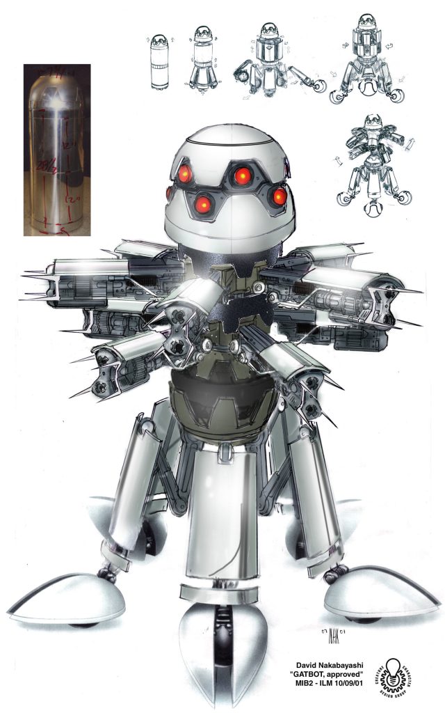Nakabayashi recalls his experience collaborating with director Barry Sonnenfeld on Men in Black II (2002). “I was tasked to take a trash can and turn it into a killer robot. I liked the idea that it opens up like a flower, and it comes with multiple gun turrets that are not necessarily normally situated in a standard military platform. Maybe it’s more like an orchid. With a few changes, the design went to computer graphics, and I helped develop it in dailies with the modelers, painters, and animators.”